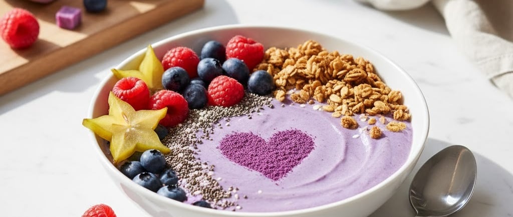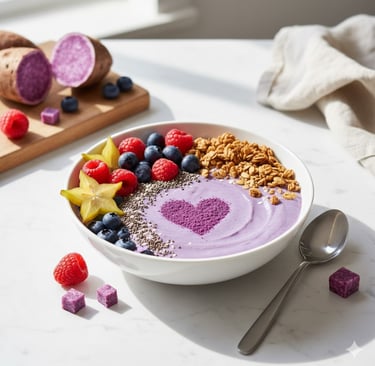 Mon astuce de "Consultante F&B" : Misez sur la texture et le contraste. Mélangez l'Ube à votre yaourt grec végétal ou à votre skyr (pour les protéines) et décorez avec des baies rouges (myrtilles, framboises) ou du granola pour un effet croustillant/moelleux.