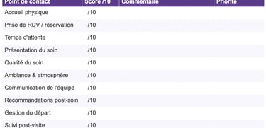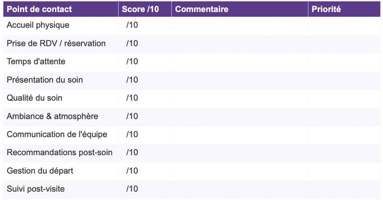Envoyez-vous un message de remerciement dans les 24h ? Demandez-vous un retour d'expérience ? Proposez-vous une offre pour la prochaine visite ? Ce point est souvent absent — et pourtant c'est lui qui transforme une bonne cliente en cliente fidèle.