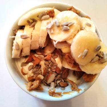 Je mélange une dose de protéine avec du fromage blanc, du granola fait maison, des graines de tournesol et un peu de beurre de cacahuète. La saveur vanille sucre et parfume mon bowl & me permet d'assurer un apport en protéines essentiel.