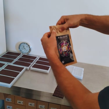 La mise en tablette et l’emballage du chocolat, réalisés à la main, directement sur place.
